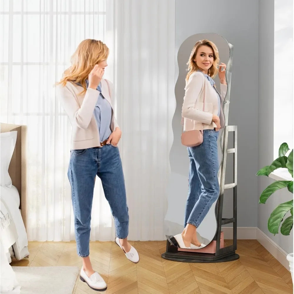 360° Rotating Jewelry Cabinet with Light, LED Jewelry Storage Box with Full-length Mirror, Lockable Wavy Mirror Jewelry Cabinet