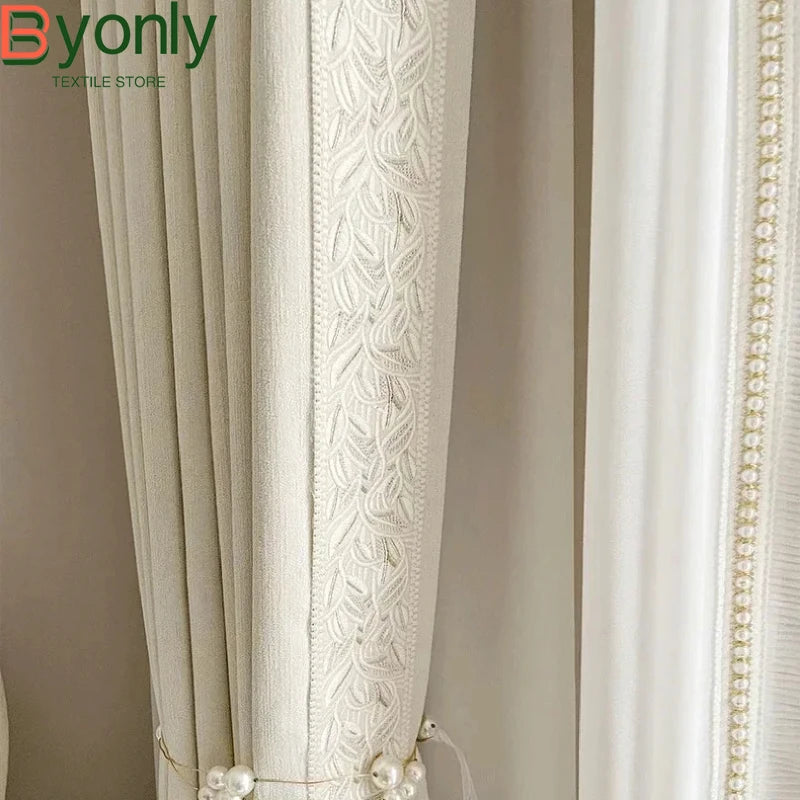 French Curtains for Living Dining Room Bedroom Cream Cured Embossed Chenille Texture Thick Window White Tulle Sheer Curtain