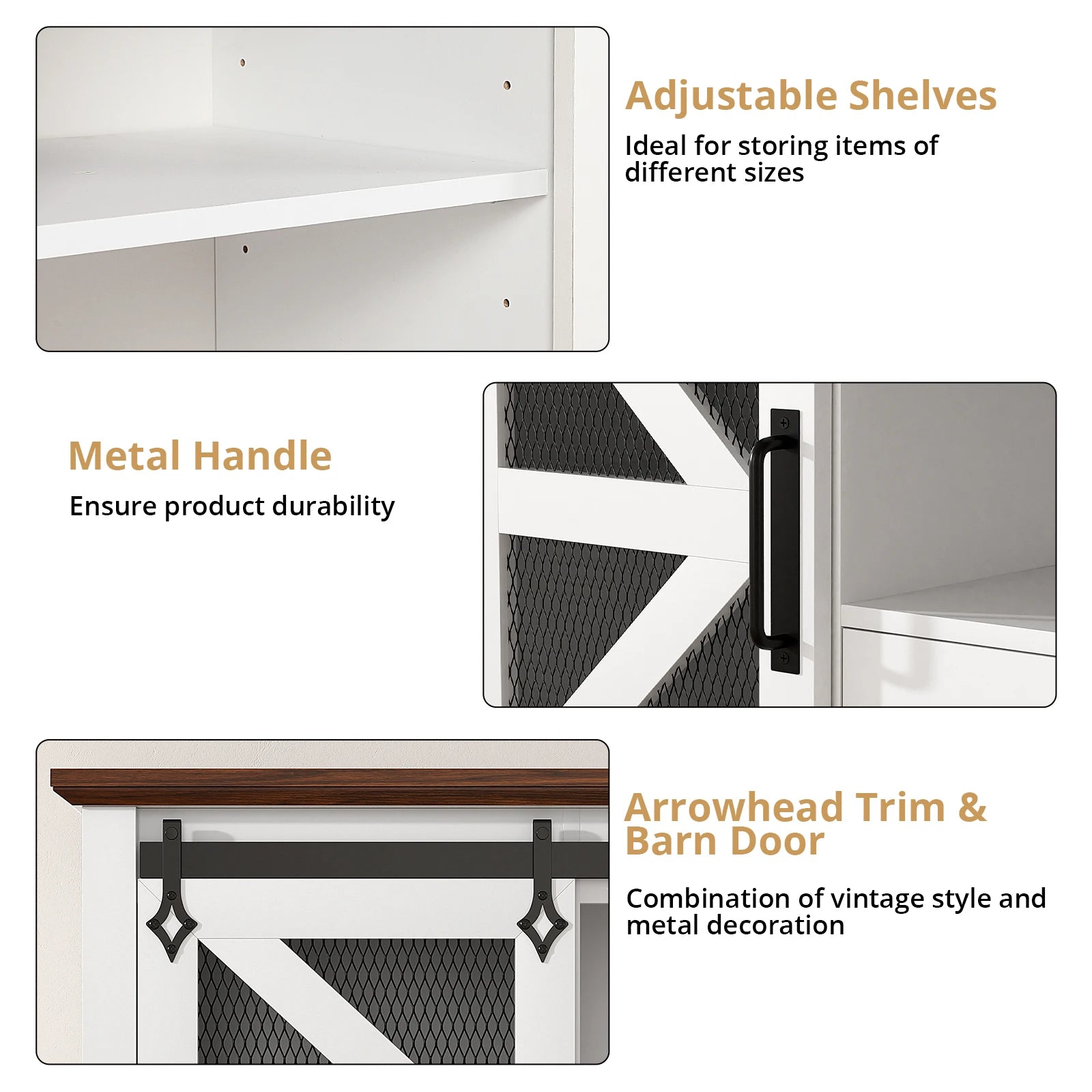 - Farmhouse-modern design with a textured tabletop, clean frame, barn-door-inspired accents, and metal arrowhead details to suit rustic, industrial, or vintage décor.
