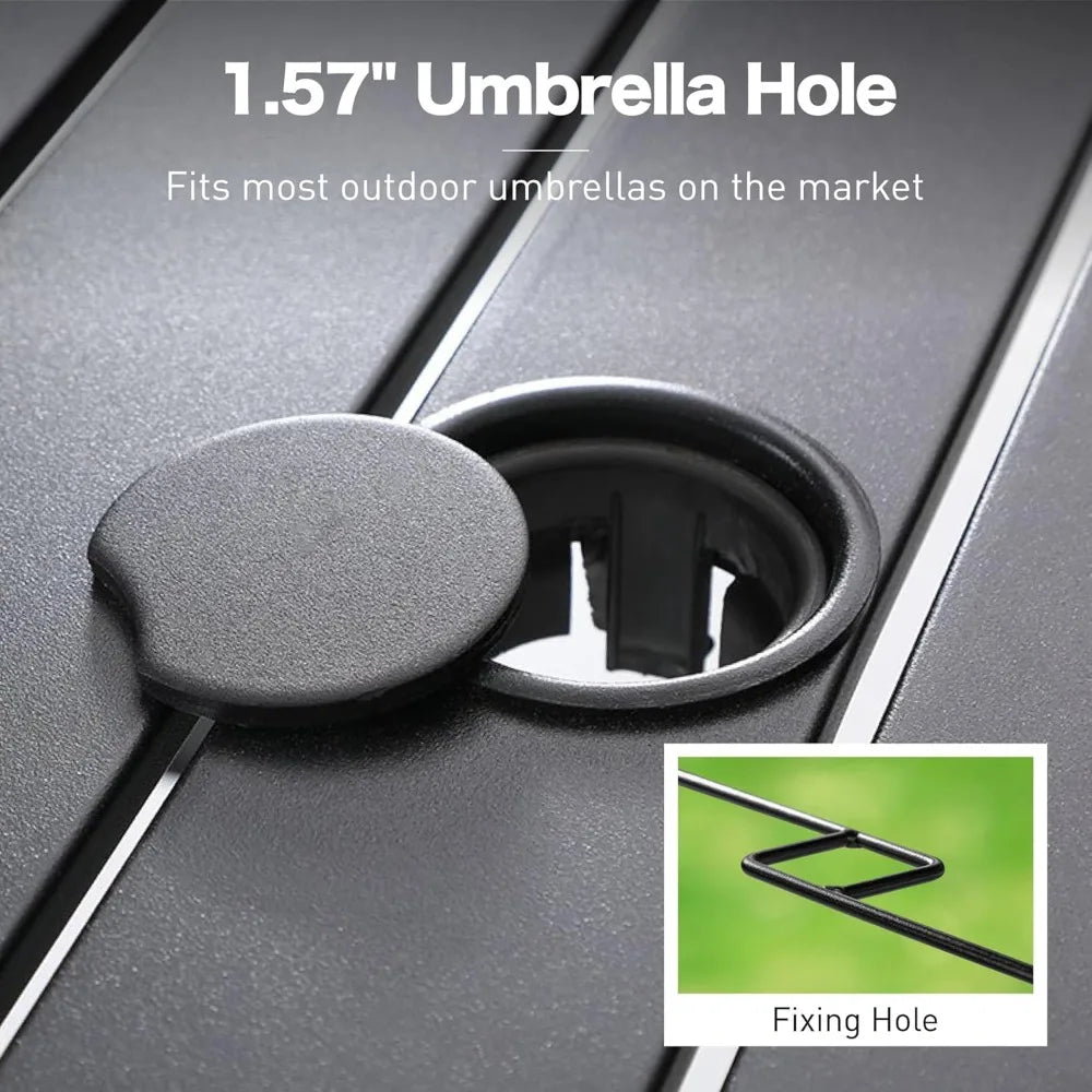 - Umbrella hole keeps you shaded during meals or conversation, so you can stay comfortable on sunny days and adjust the angle as the sun moves.